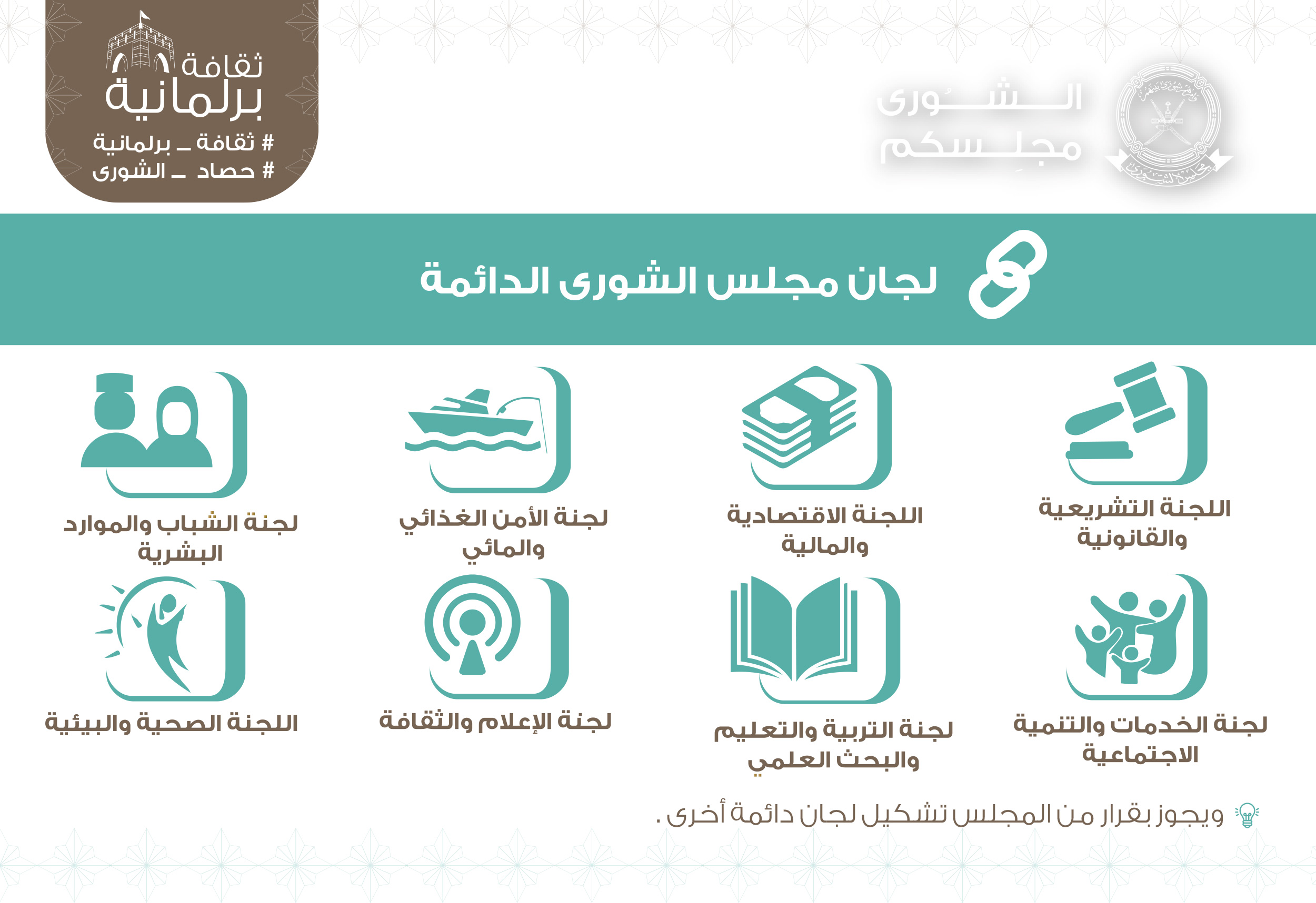 لجان الصداقة البرلمانية السير الذاتية إحصائيات مطبوعات إعلامية كتب صادرة عن مجلس الشورى. مجلس الشورى هو المجلس المنتخب من قبل الشعب يتمتع بالشخصية الاعتبارية المستقلة اداريا وماليا ويمثل أحد جناحي مجلس عمان الذي يضطلع بصلاحيات تشريعية ورقابية نص عليه النظام الأساسي للدولة بما يخدم الصالح العام للوطن. لجان المجلس هي عمود العمل التشريعي وتشكل خلال الأسبوع الأول من دور الانعقاد العادي ويضم مجلس الشورى ست لجان نوعية دائمة متخصصة لدراسة كل ما يحال إليها من مشروعات القوانين والاقتراحات بقوانين.