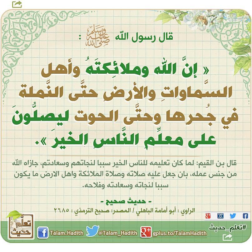 تعل م حديث No Twitter إن الله وملائكته وأهل السماوات والأرض حتى النملة في جحرها وحتى الحوت ليصلون على معلم الناس الخير تعلم حديث Http T Co Ggpo3lk3ce
