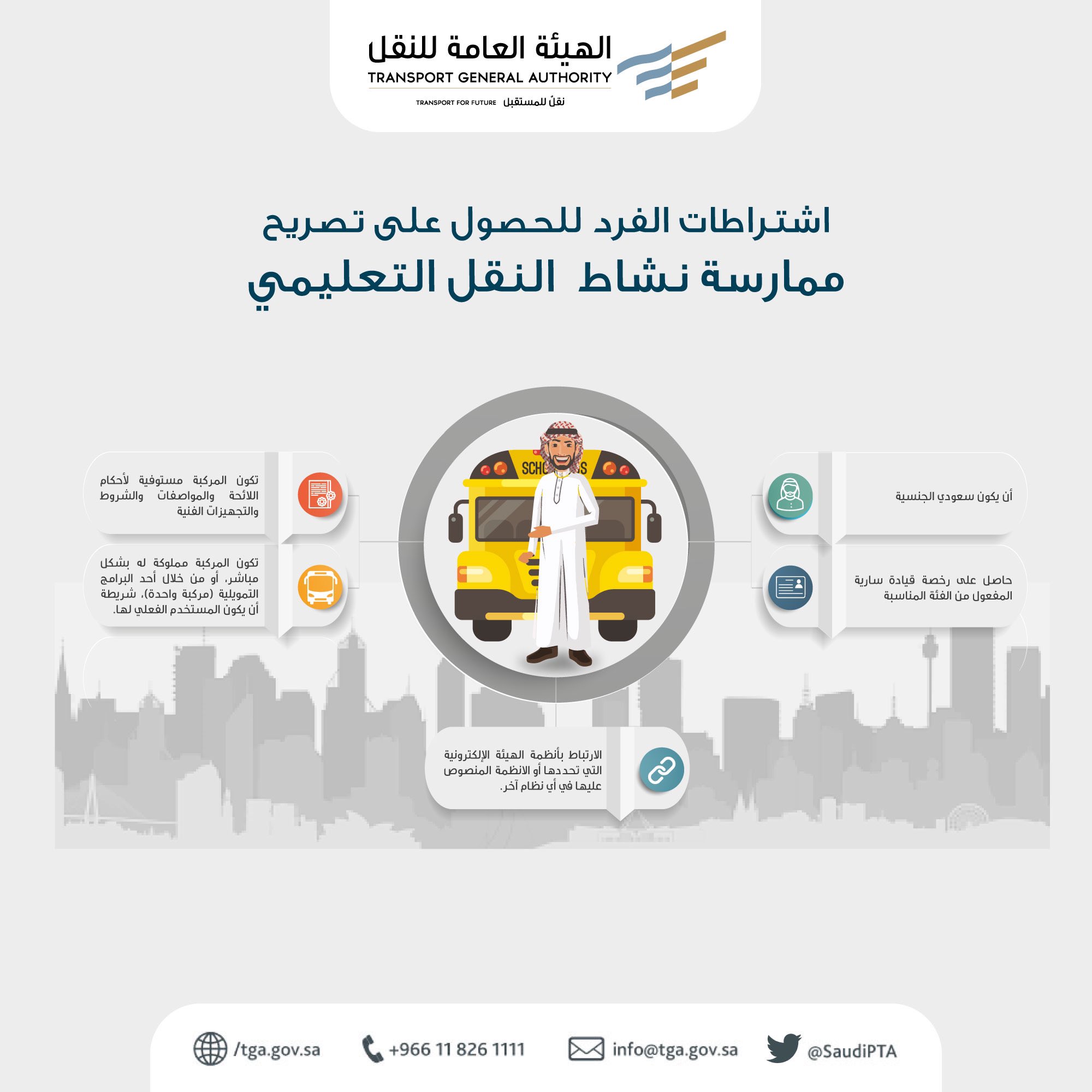 أعلنت الهيئة العامة للنقل عن إصدار لائحتها الجديدة المنظمة لنشاط النقل التعليمي لتنظيم نشاط ضمن أكبر أنشطة النقل البري في المملكة الذي يحظى باهتمام مختلف مكونات المجتمع السعودي ويتصل بالسعي القائم لتطوير خدمة نقل موجهة. هيئة العامة للنقل خدمات الوزارة محدد حاليا الخدمات الإستعلامية خدمات الصيانة خدمة البلاغات الخدمات العامة خدمات النقل البري والبحري المركز الإعلامي الأخبار مجلة النقل. هيئة العامة للنقل خدمات الوزارة محدد حاليا الخدمات الإستعلامية خدمات الصيانة خدمة البلاغات الخدمات العامة خدمات النقل البري والبحري المركز الإعلامي الأخبار مجلة النقل.